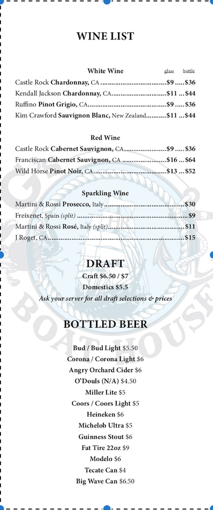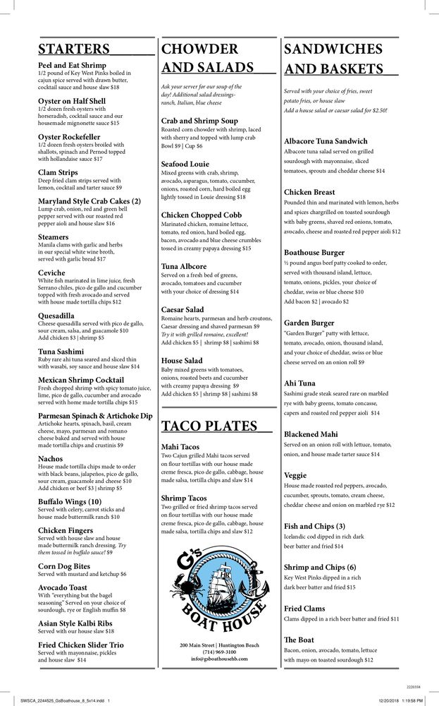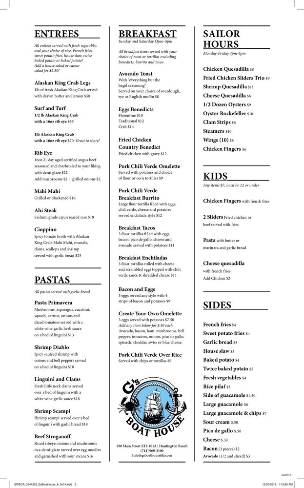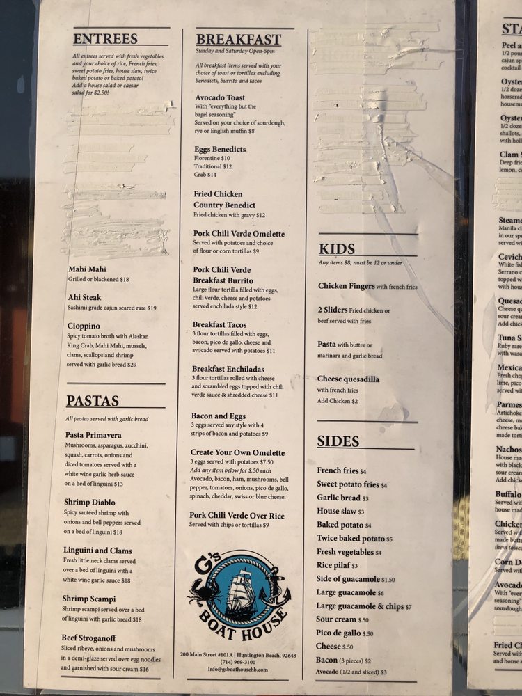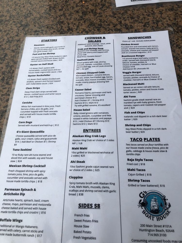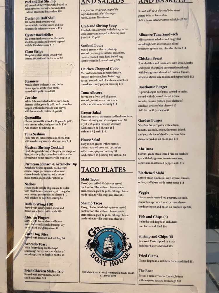 G's Boat House is a delightful New American seafood spot in Huntington Beach, CA known for its tasty tacos. With a diverse menu offering Alaskan King Crab Legs, Beef Stroganoff, Filet Mignon, and Rib Eye among many others, this restaurant caters to all palates. Their Chicken Chopped Cobb salad, Crab & Shrimp Soup, and Clams Casino starters showcase their commitment to quality and flavor. Customers rave about the amazing food, great pours, and local vibe, making it a must-visit establishment. The inclusive amenities like free Wi-Fi, vegetarian options, gender-neutral restrooms, and happy hour specials ensure a pleasant dining experience for all guests. G's Boat House truly stands out for its delicious dishes, friendly service, and cozy atmosphere.